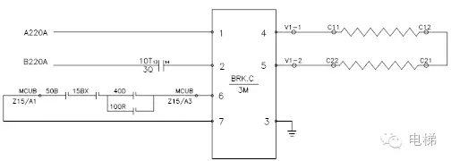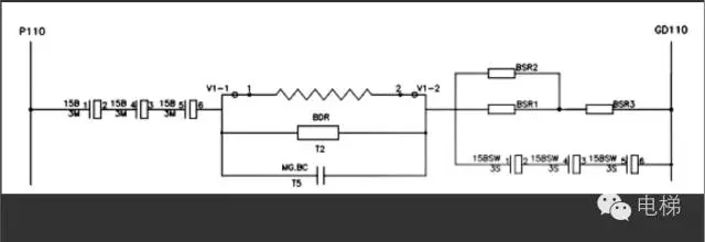2.當抱閘控制方式為接觸器驅動(dòng)時(shí),使用日立HSGL型主機或廣日主機,使用抱閘接觸器對抱閘供電控制,控制柜內有BDR及BSR制動(dòng)電阻。其抱閘控制回路如下圖所示:
