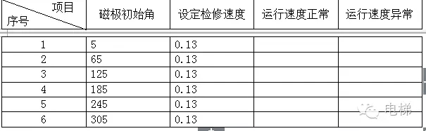 ⑷ 按下表的方式以每次對F7.09(磁極初始角)加60的方式進(jìn)行記錄,最終保證檢修時(shí)速度等于設置的檢修速度;