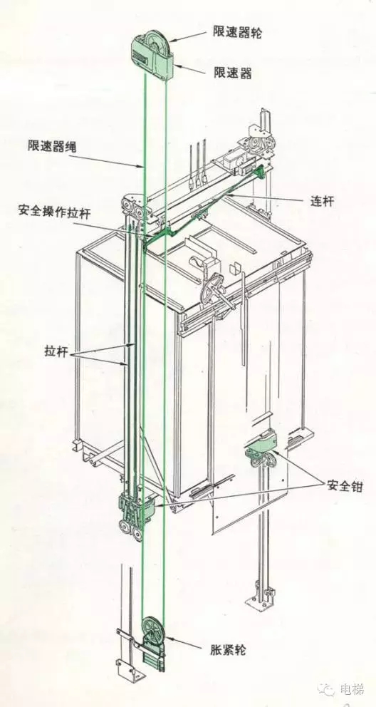 限速器的鋼絲繩圍繞著(zhù)繩輪和底坑中的脹繩輪形成一個(gè)閉環(huán),其繩頭部與轎廂緊固在一起,并通過(guò)機械連桿與安全鉗連起來(lái)。如果轎廂超速,限速器立即動(dòng)作,觸發(fā)夾繩裝置夾緊鋼絲繩。當轎廂下降時(shí),鋼絲繩拉動(dòng)安全鉗運作使安全鉗對導軌產(chǎn)生摩擦力,把轎廂迅速制動(dòng)在導軌上,停止運動(dòng)。(見(jiàn)下圖)